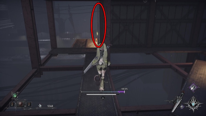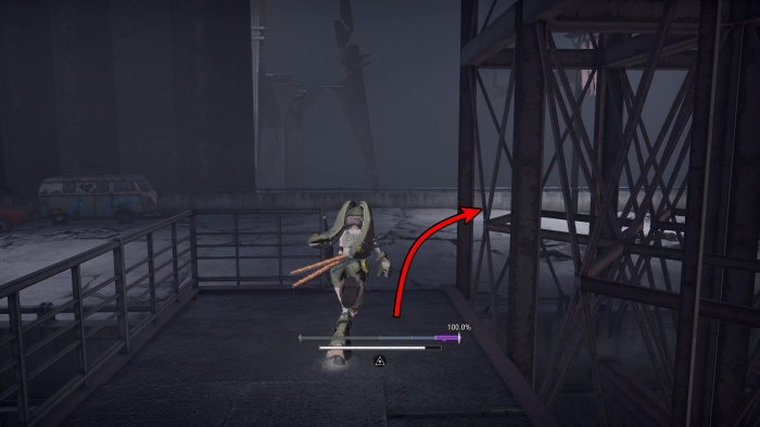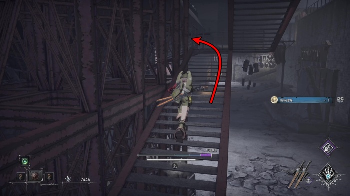画像の足場が悪い場所に来たら、ハシゴを上がりましょう。