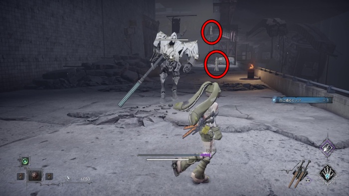 ハシゴを降りて先に進んだら、棒の敵と長剣の敵がセットでいます。長剣の敵は遠距離からでも雷を落としてくるため、先に長剣の敵を倒しましょう。また、奥の階段中腹にいる敵も倒してから棒を持った敵を倒すのが一番安全です。