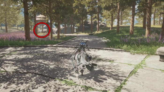 道なりを進み、噴水があるエリアから画像の方に進むと武器の最終強化素材「虹光」が落ちています。
