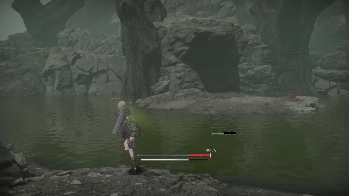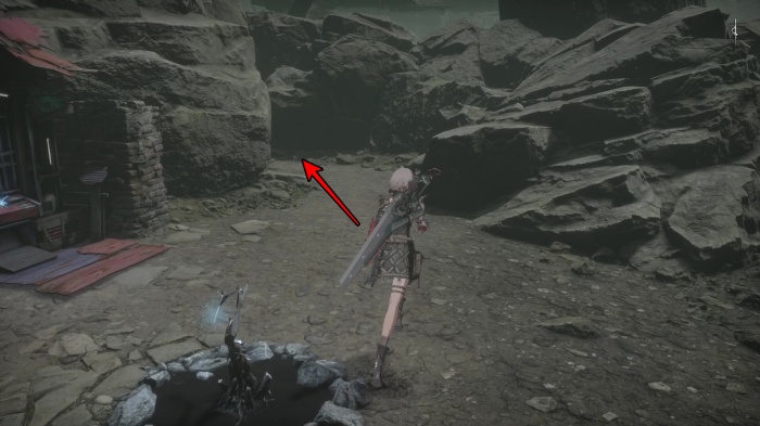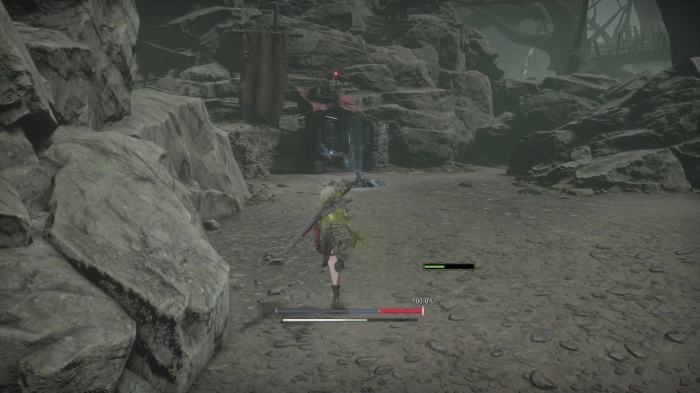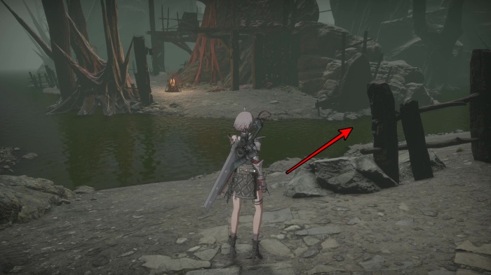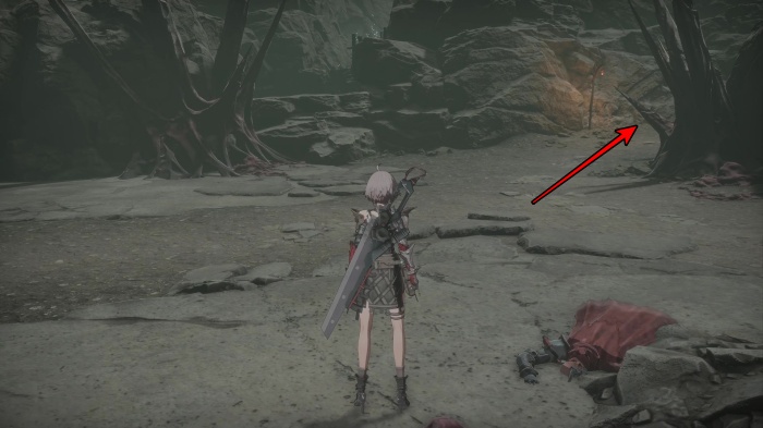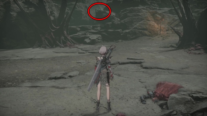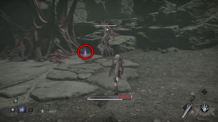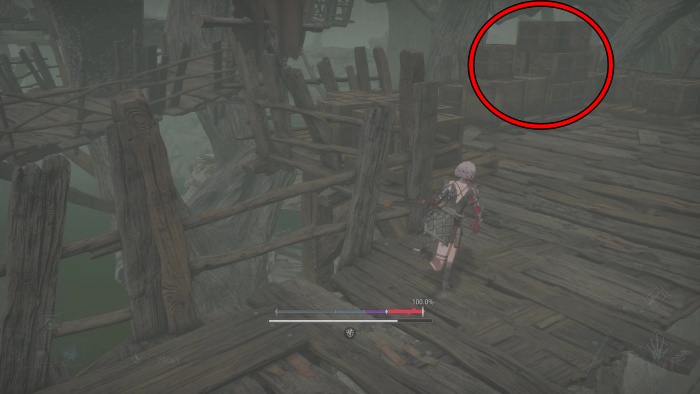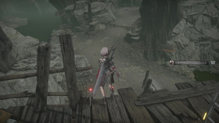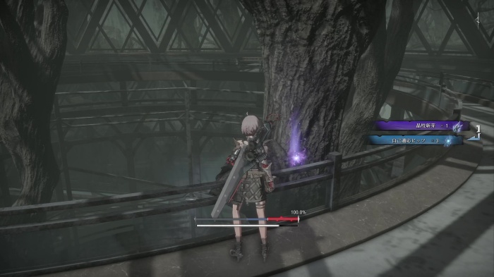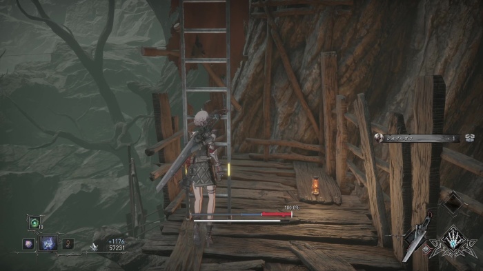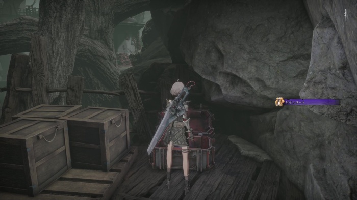 木箱を壊すと柵が壊れてて下の足場に降りることができます。ハシゴの前に従印「枯木の証」があります。ハシゴを降りると、カタツムリがいて倒すと「精華の雫」を落とします。