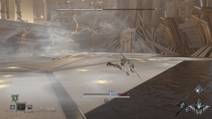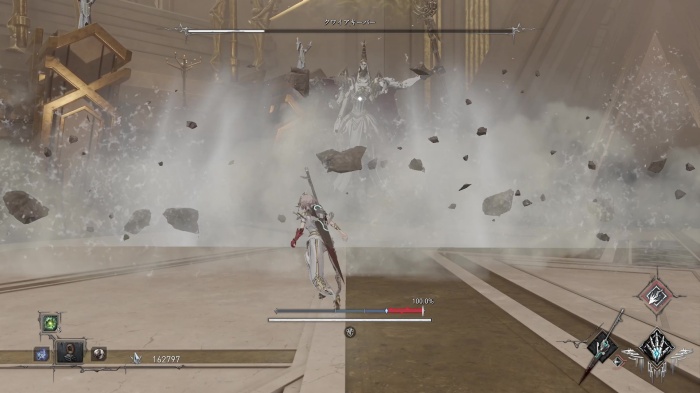 右手を振り下ろして雷球を叩きつける攻撃は振り下ろすモーションが見えたらバックステップでその場から離れましょう。叩きつけ後に広範囲の爆発が起きますが、バックステップ連打で回避可能です。