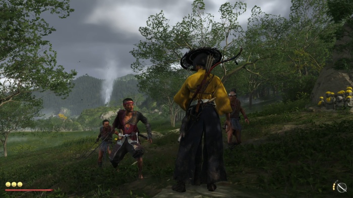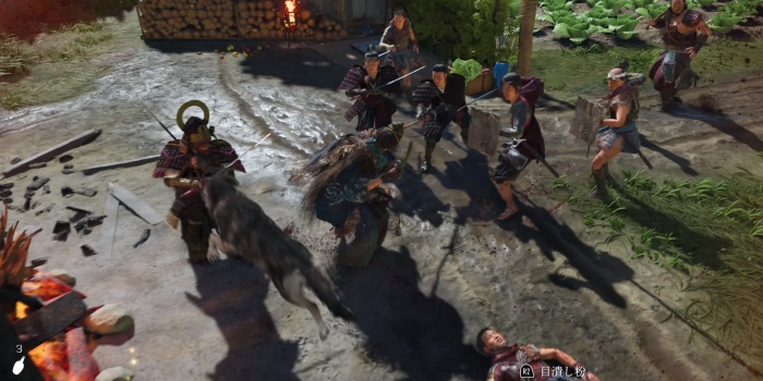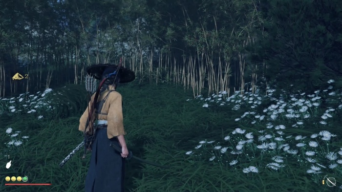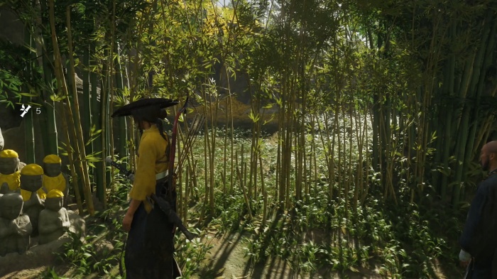 敵を倒し、竹藪を刀で斬って先に進むと、さらに大量の敵がいるのですべて倒す。