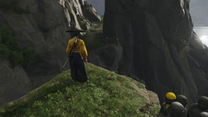 地蔵のそばに鉤で降りられる場所があるので降り、地蔵がいる方に向かって、鉤やジャンプを使って進んでいく。