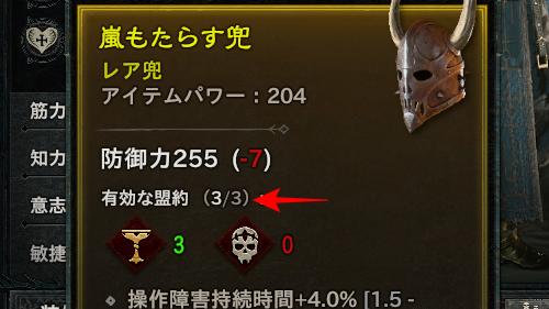 血の収穫ゾーンで入手できる各盟約の消費アイテムを装備に使用することでその装備に使用したアイテムに応じた盟約を1つ追加することができます。