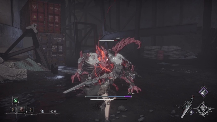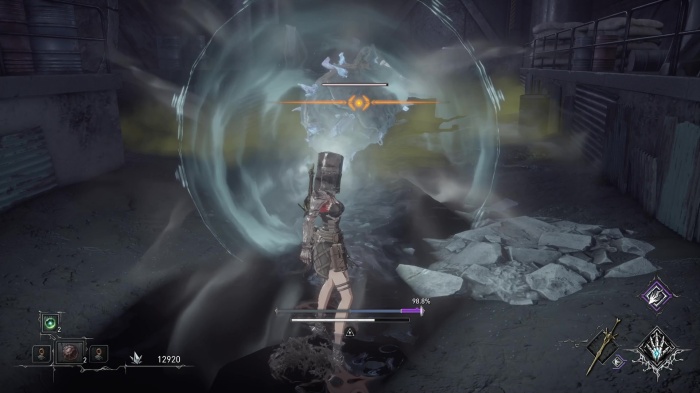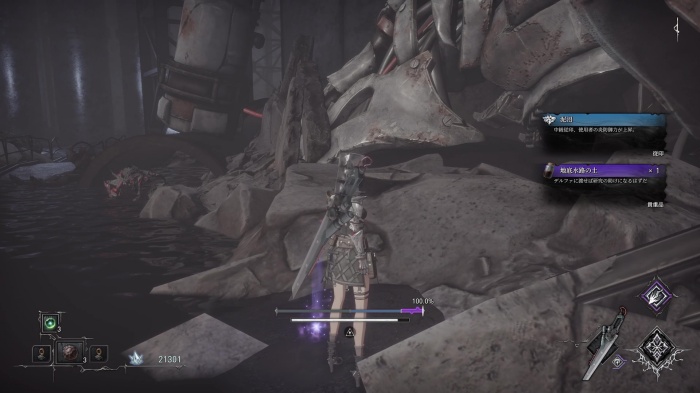 通路の先ににはカタツムリ型の敵がいます。普通に攻撃しても硬すぎてダメージを与えられませんが、突進にタイミングよくCフィールドで弾くことで、一撃で倒すことができます。倒すと命の雫の回復量が増える「精華の雫」を入手できます。