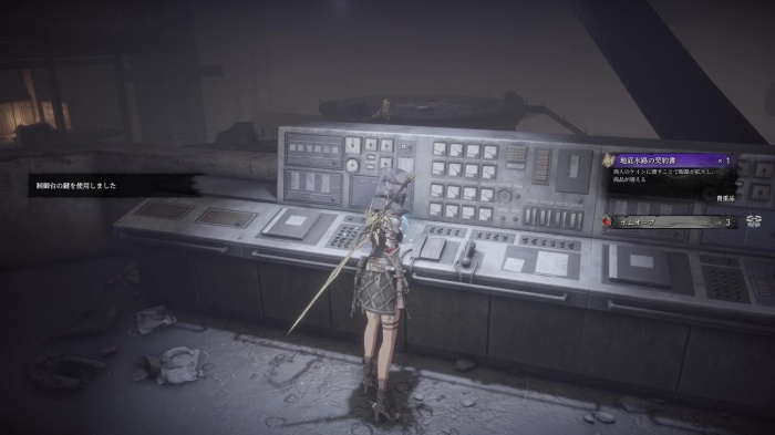 制御室の鍵を使用して通路の向きを変えます。制御盤の左側にエレベーターがあるのでこれも起動しておきましょう。