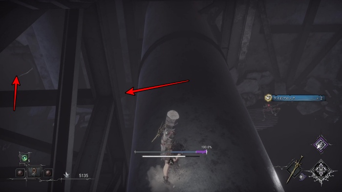 向きを変えた通路を通り、柵がないところからパイプの上を進みましょう。穴が空いているので飛び降りましょう。
