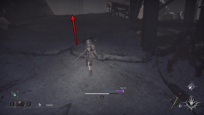 スタートしたら右側から通路に上がり、まっすぐ進みましょう。突き当たりで右に曲がり坂を上がります。