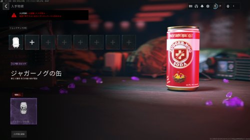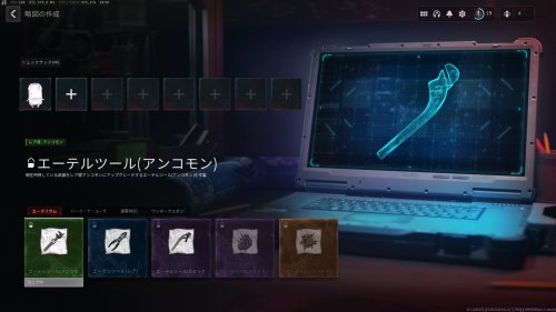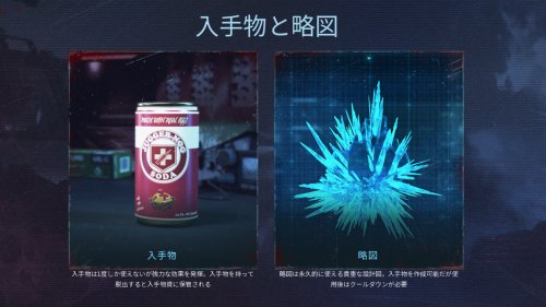 入手物は1度しか使えないが強力な効果を発揮する。入手物を持って脱出すると入手物資に保管される。略図は永久的に使える設計図で入手すると出撃前に入手物をクラフトして持ち込むことができます(1度使用するとクールタイムあり)