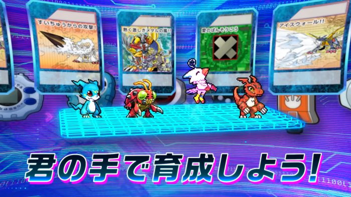さらに、ゲーム内のドットイラストは すべて新規描き下ろしとなっており、デジヴァイスや旧デジモンカードゲームなど、シリーズならではの様々な要素を楽しむことができます。