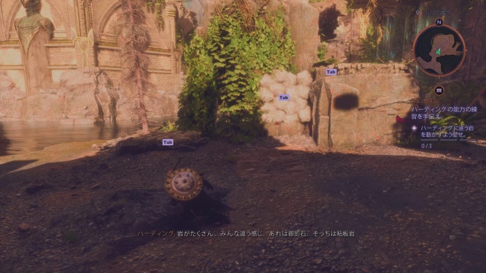 3箇所の岩を動かしてもらいます。岩を使って進んだ先に宝箱があり、ハーディングの中装鎧「洞窟探検家の装備+2」が入っています。