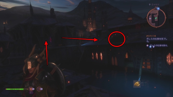 ハシゴを上がって戻る前に浸水地区にある宝箱を開けましょう。屋根を伝っていき、ルカニスの「悪意」の導きで足場を作り、屋根に穴が空いた家があるのでそこを飛び降りて宝箱を開けましょう。戦士の場合「黒カラスのくちばし+2」