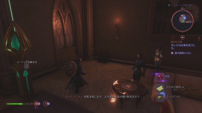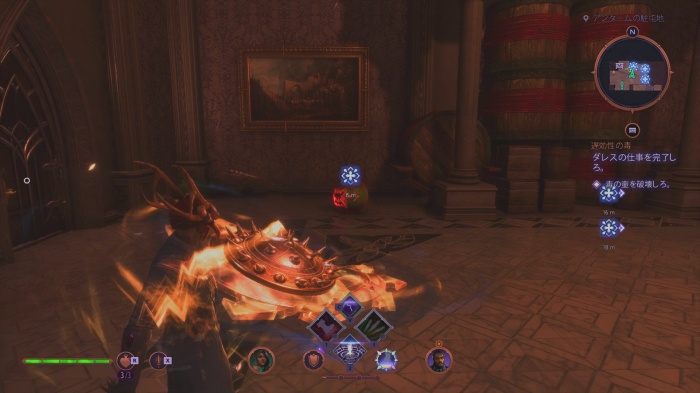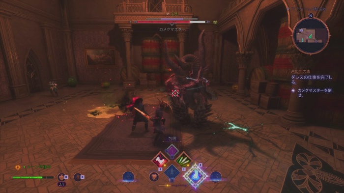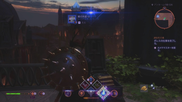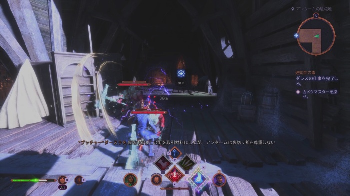 扉を開けたら戦闘、ジップラインを伝って戦闘、室内に入って戦闘と戦闘が続きます。ベランダに宝箱があり中にルカニスの中装鎧「カラスの外套+2」