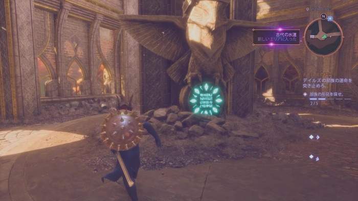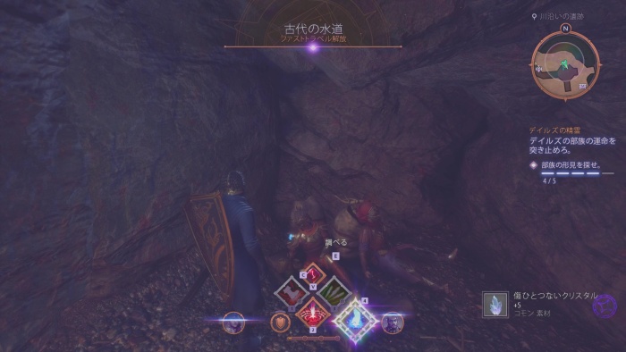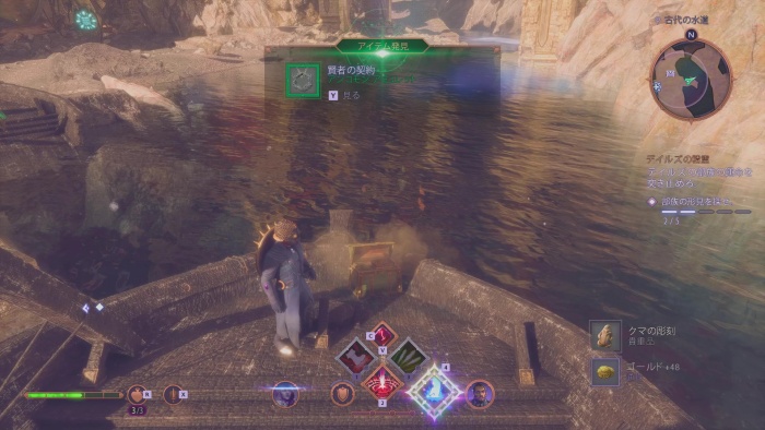 古代の水道にあるフクロウの像を調べると像の後ろに光が出現し、近づくと爆発するのですぐに離れましょう。爆発すると壁が壊れ、宝箱を開けられます。戦士の場合は「反抗的な沈黙+2」があります。