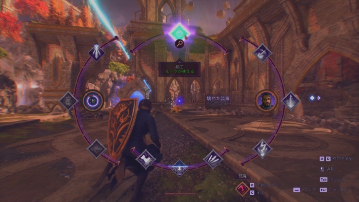 「永遠の讃歌」で石壁を動かし、「細工」で壊れた装置を修理します。岩に乗ったら石壁をもう一度動かし、ワープゾーンに入ります。