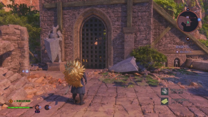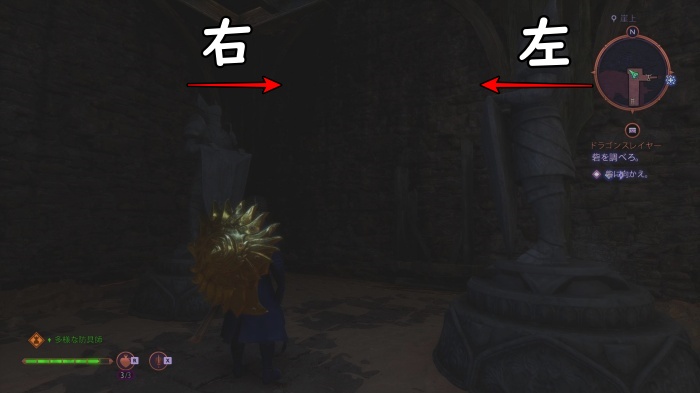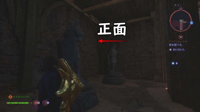砦の途中で鉄格子の先に宝箱があります。鉄格子のあげ方はハシゴ下にある3つの石像を左を「右」真ん中を「左」右を「正面」に合わせると開きます。