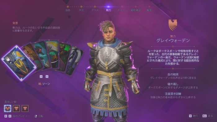 背景によって場所による名声の溜まりやすさ、ある敵に対するダメージ上昇などのパッシブがありますが、個人的にはHPと防御力が「グレイ・ウォーデン」がおすすめです。