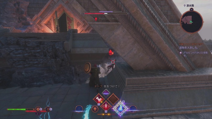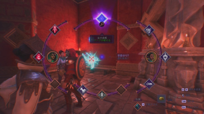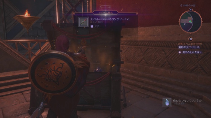 室内に入ると宝箱があり、戦士の場合「スペルバウンドのロングソード+1」が入っています。神殿内の小部屋でアビリティホイールを開きナーブが使える「女の直感」を指示しましょう。