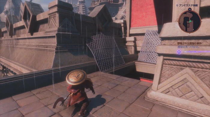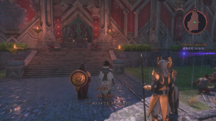 神殿の入り口は閉鎖されております。左側に神殿の裏口に続く道があるので階段を上がりましょう。目的地に到着すると神殿への裏口が見つかります。