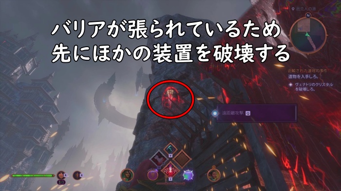 ヴェナトリのクリスタルはバリアが貼られており、壊すことができません。まずはクリスタルにバリアを貼っている装置から遠距離攻撃で破壊して行きましょう。また、バリアが貼られている装置も破壊できないため、バリアが貼られていない装置から順番に破壊しましょう。
