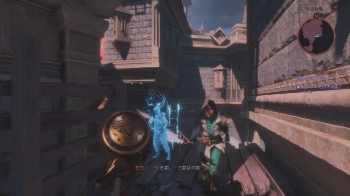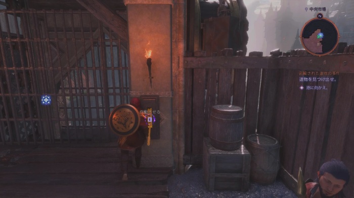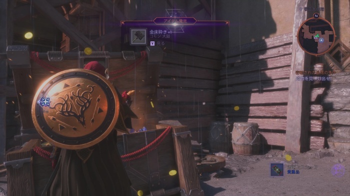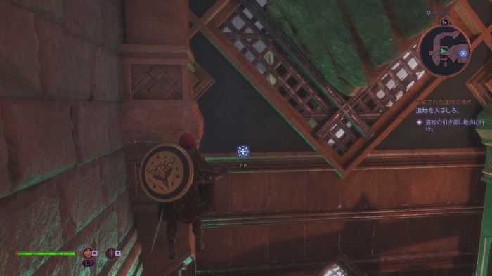 画像の瓦礫を登ってから壊れた窓にジャンプして小部屋に侵入しましょう。中には記念品「多くの手足を持つ像」や、宝箱があり戦士の場合「光と影の兜+1」が入っています。