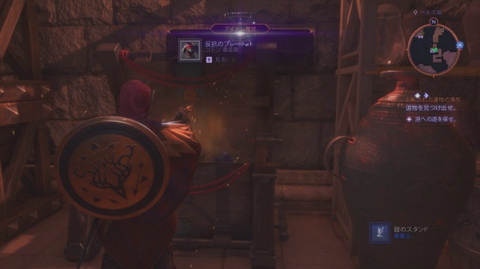 ジップラインに乗り、先に進むと宝箱があります。戦士の場合は「金床砕き+1」が入っています。