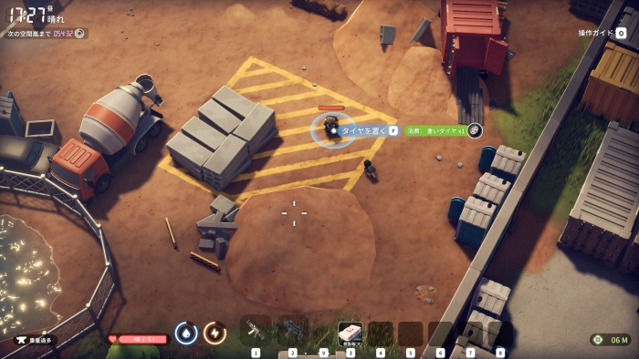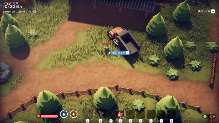タイヤは農場町の山際の農家にあるダンプトラックの近くに置いてある。入手したらそこから西にある仮設工事現場の赤いコンテナまで運ぼう。