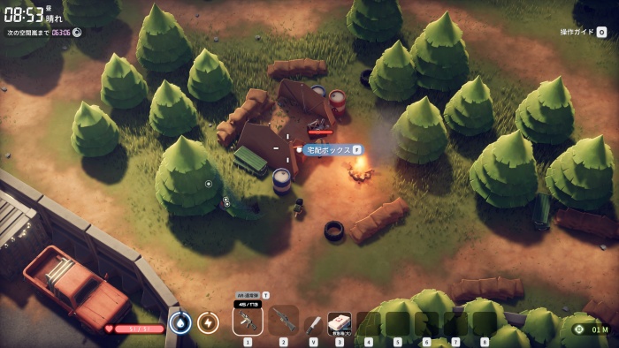 | エリア間の配達は稼ぎがいいぞ。今回はエリアゼロの森の小道の近くにあるキャンプから、農場町中央オフィスビル1階のトイレ前までだ。 |