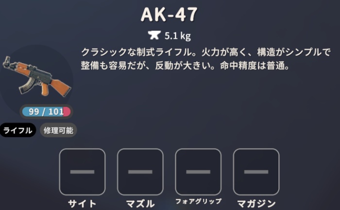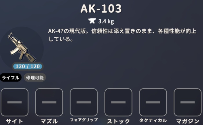 AK-47よりダメージが1高く、アタッチメントはMFと同じ6つとカスタマイズ性も高い。AK-47の上位互換なので、入手したらAK-103に乗り換えるのがおすすめ。