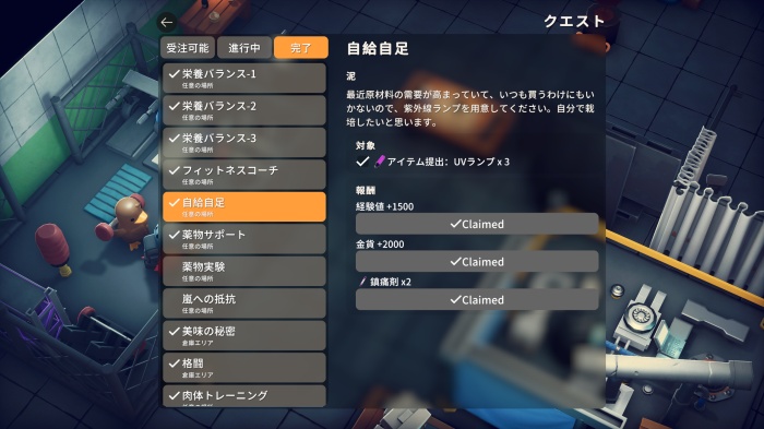 トレーニングルームは拠点を出て北東の家にいるNPC「泥」から受けられるクエスト『フィットネスコーチ』をクリアするとトレーニングルームが建設できるようになります。