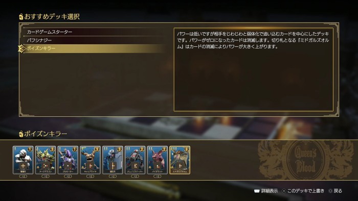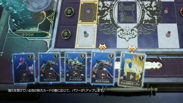 クイーンズ・ブラッド(カードゲーム)大会は第5章で発生するイベントです。5戦の戦いに勝利し、6戦目のレッド13に勝つことで最大報酬とトロフィー「クイーンズ・ブラッド完全優勝」を獲得できます。