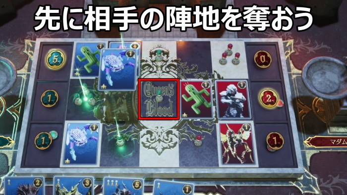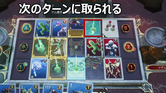 3列目にカードを配置し、4列目を自分の陣地にすると5列目に相手がカードを配置し、せっかく自分の陣地にした4列目を取られてしまいます。