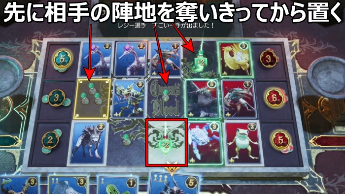 中盤、ランクが上がった1列目の陣地にはまだ置かず、2列目を埋めながら3列目4列目にできた敵の陣地を奪っていき、自陣を増やして相手がカードをできるだけ置けないようにしましょう。