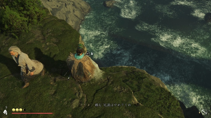会話後、崖を降りて、鉤ジャンプなどを使って崖際を進んでいく。