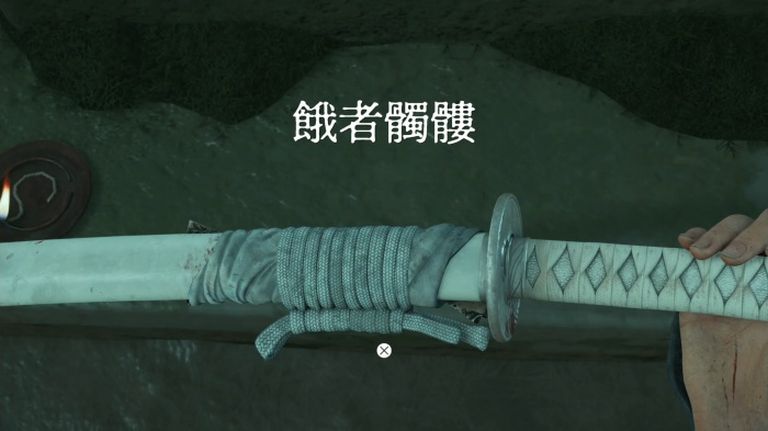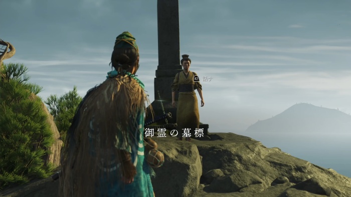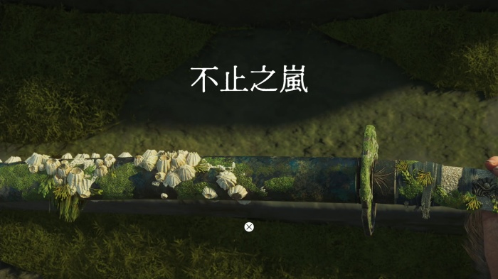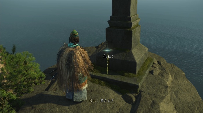 村人の女性と話し、会話後に墓標にある刀を拾うと、刀装具「不止之嵐」入手。