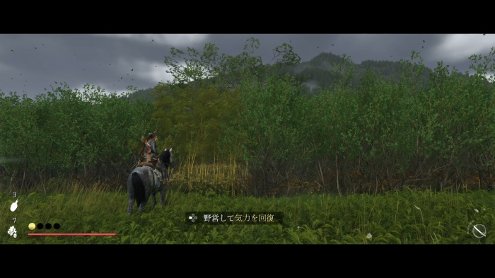 そばには藪があり、藪の中には黄色い竹を斬ると中に入れるものがあり、野営や宝箱があったりするので、気が向いたら探索しておこう。