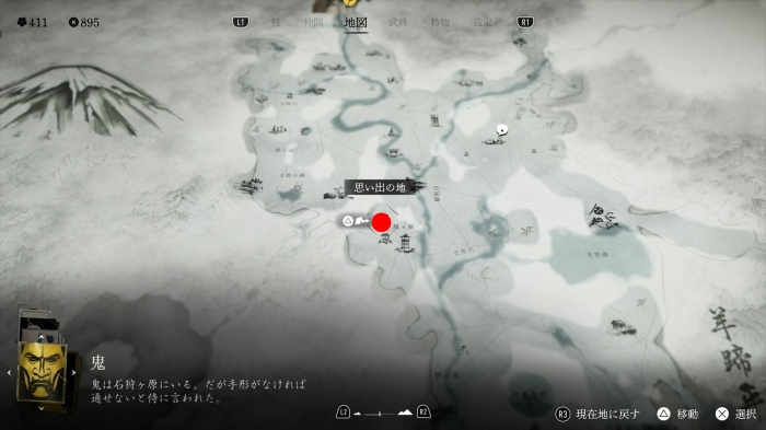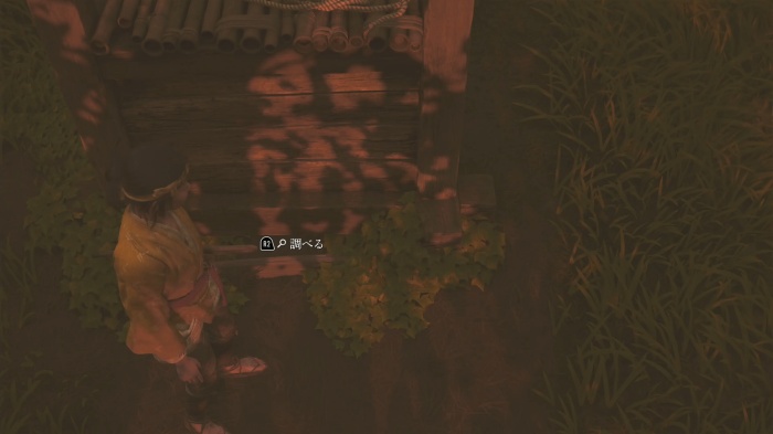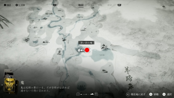 坂を下った先でR2を押して「鉤」を使って、ロープアクションで高台へ向かい、床を調べると、面「春夢の半頬」入手