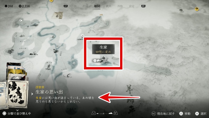 生家では、篤之道や浮世草などを進めていると、一定数クリアする毎に、追想ポイントが出現する。なので、クエストをある程度進めたら、地図で生家を確認し、追想が出現していないかチェックしよう。