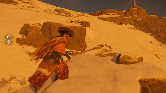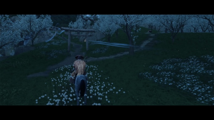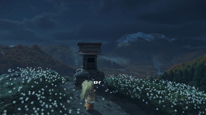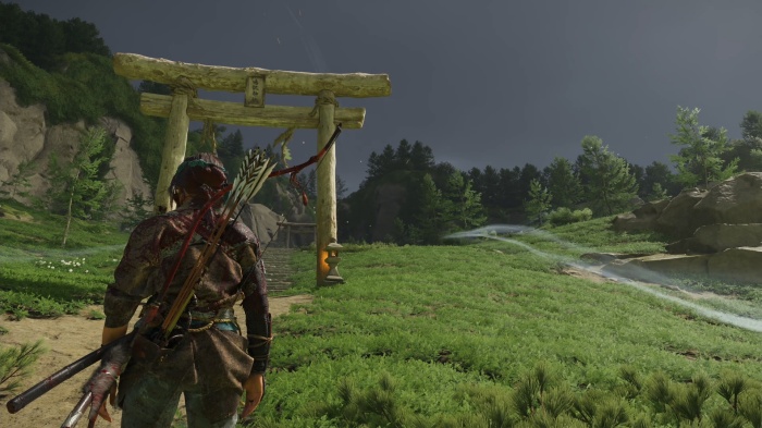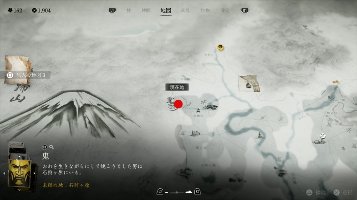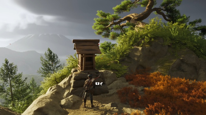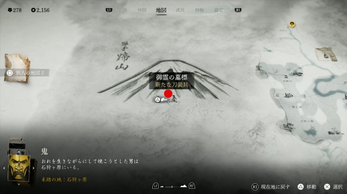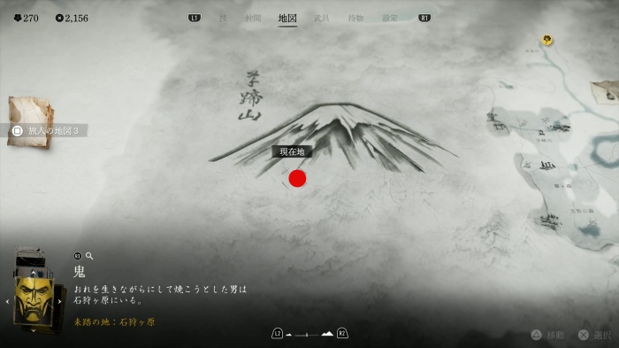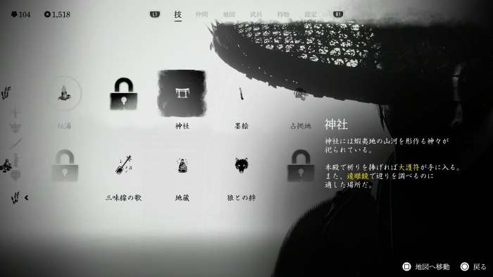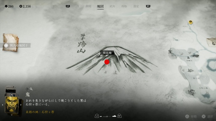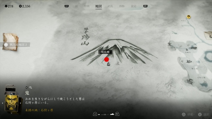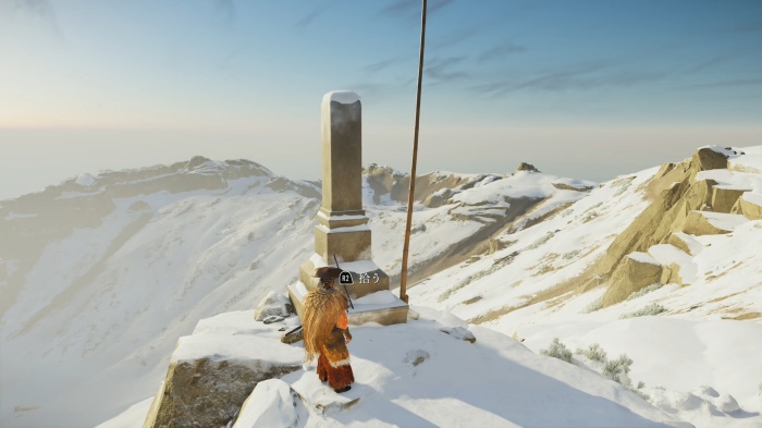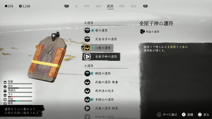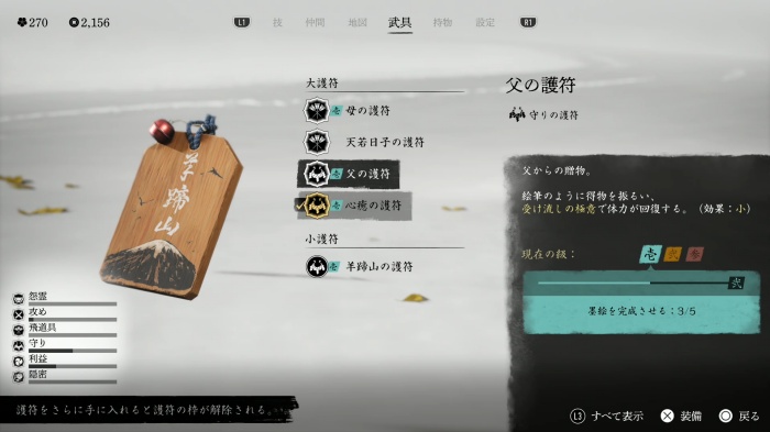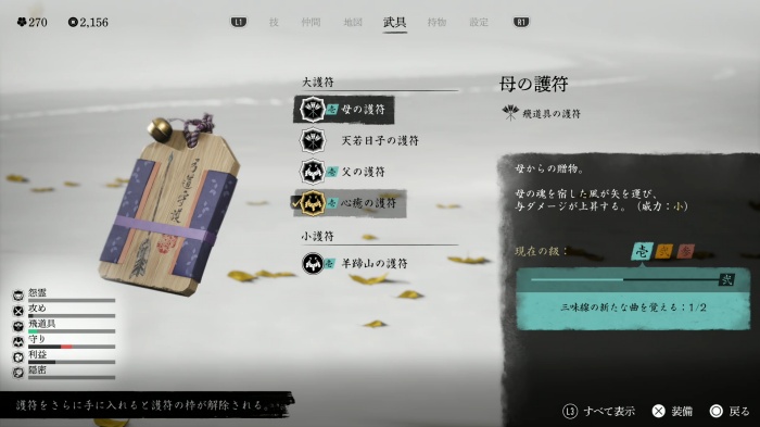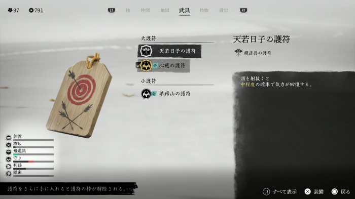 頂上の社に「礼」をすると、護符「天若日子の護符」(ヘッドショット時に確率で気力回復)入手。