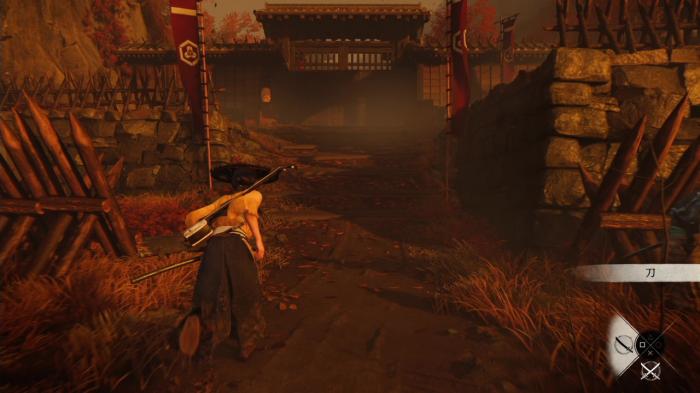 崖エリアを抜けて門を進んだ後は、左側に沿って進むことで敵にばれることなく先に進むことができます。