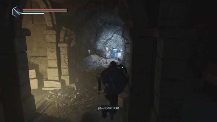 井戸に降りたら敵が出現します。倒したら地下の探索をしましょう。中性のリムビック杖(Z)が落ちています。途中で松明のギミックがありますが、触らず先に進みましょう。さらに地下に降りていくと赤ちゃんを抱えた女性がいます。近くに落ちている空の哺乳瓶を入手し、農場まで戻って農場主からミルクをもらってきましょう。