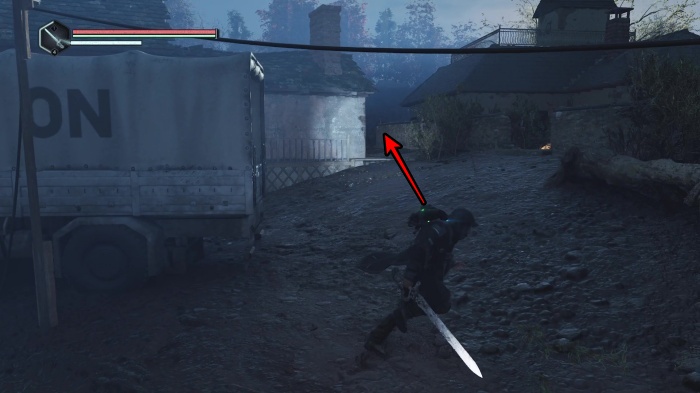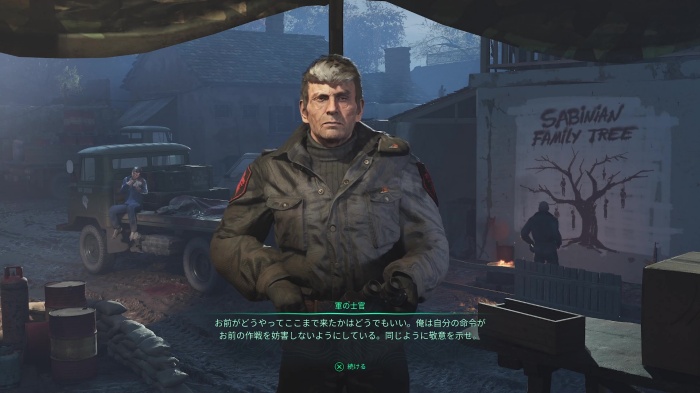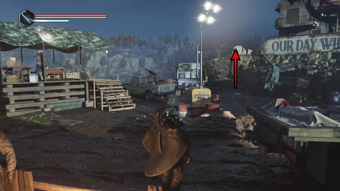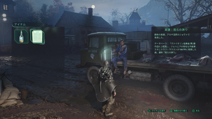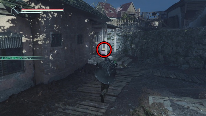 バイオリンの男性から左奥に進み、ONと書かれたトラックの右側にある細道に進みます。酔っ払った兵士がいるので、ほぼ空の蜂蜜酒の瓶を渡しましょう。また、近くにある手紙-心配する妻を拾うと善行「離散」が始まります。