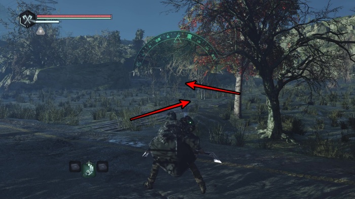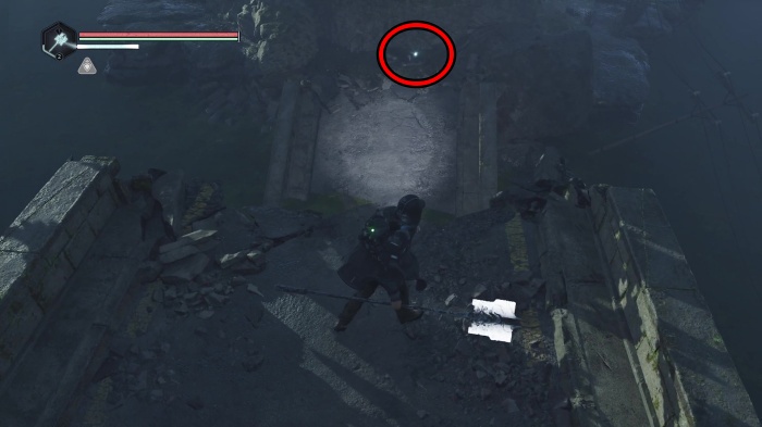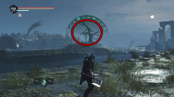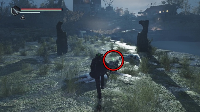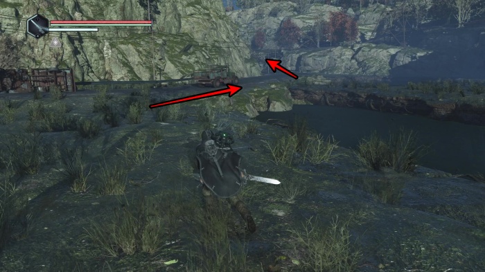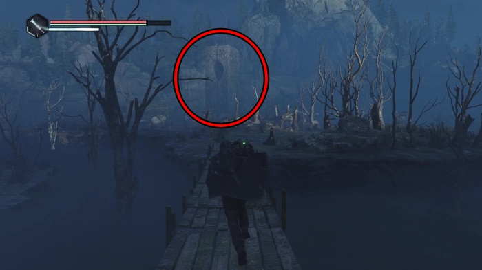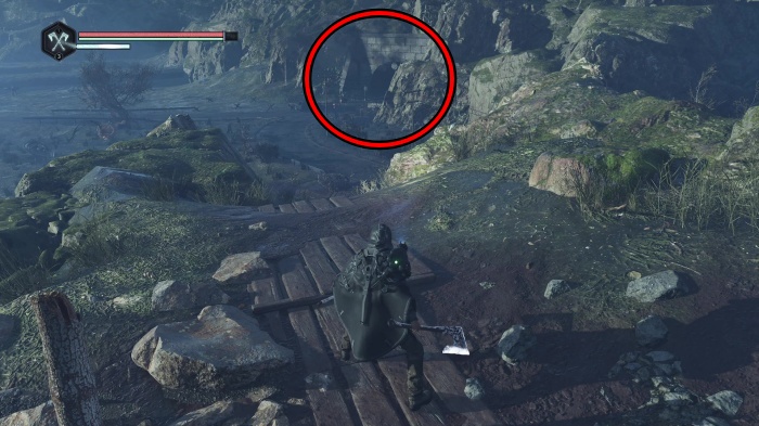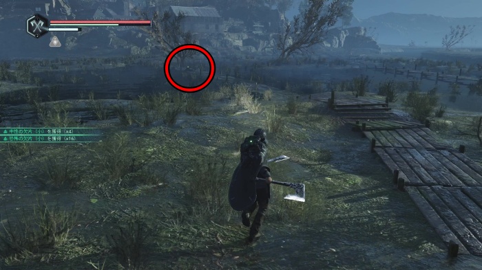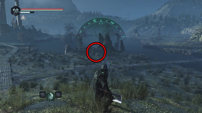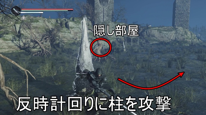 絞首刑の丘から北東に住むと4つの柱があります。画像の位置から反時計回りに柱を攻撃すると隠し部屋が開きます。隠し部屋には憤激抑制(弱)、恐怖のブローチ-恐るべき力、包装されたろうそく、手紙-我が子を誇りに思う父、リムビックの大剣があります。