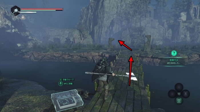 南東にセーブポイントがあります。木の橋を渡り、南東に進むと行き止まりにブロンズ製の眼が落ちています。