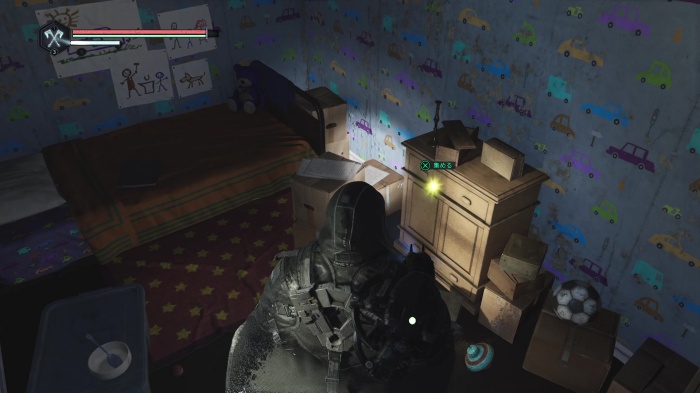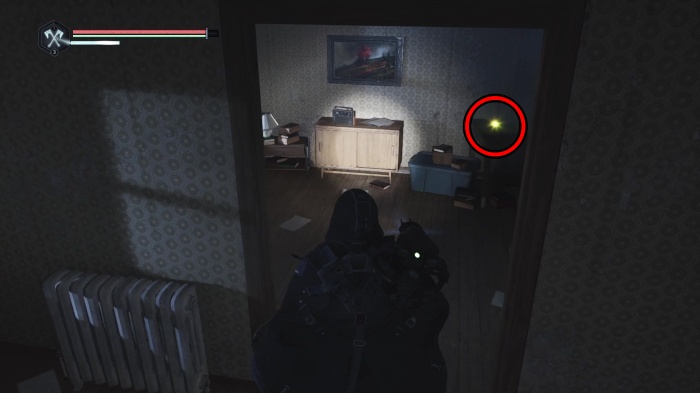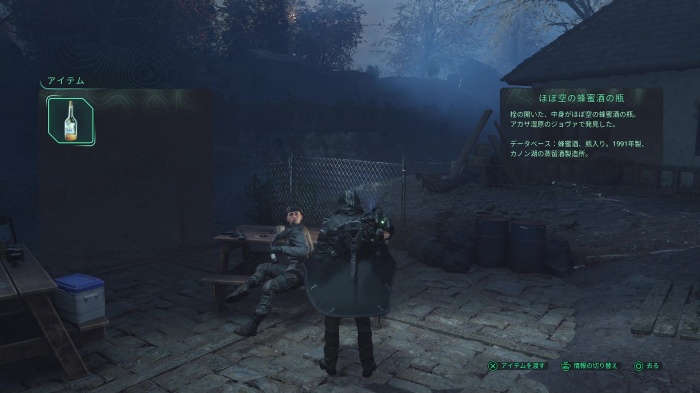 南西の落書きが書かれた建物に入りましょう。右側にスロープがあるのでベランダから2階に侵入します。1階に冷蔵庫があるので、中にあるほぼ空の蜂蜜酒の瓶を入手するとミステリー「大尉のオフィス」が発生します。