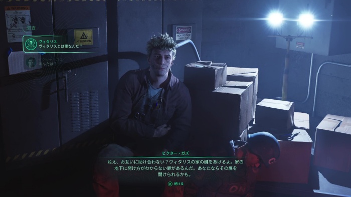 トンネル内の敵を全て倒したら整備室に入って男性に話しかけましょう。ヴィタリスの家の鍵をもらいます。