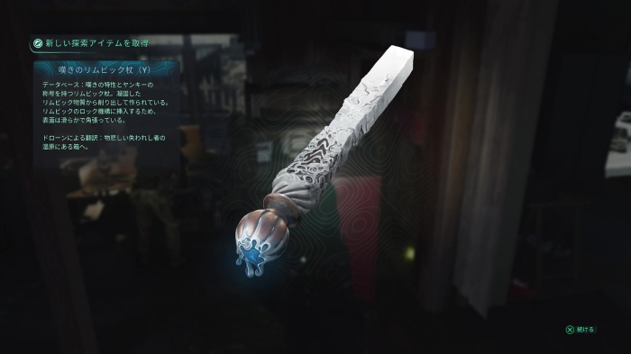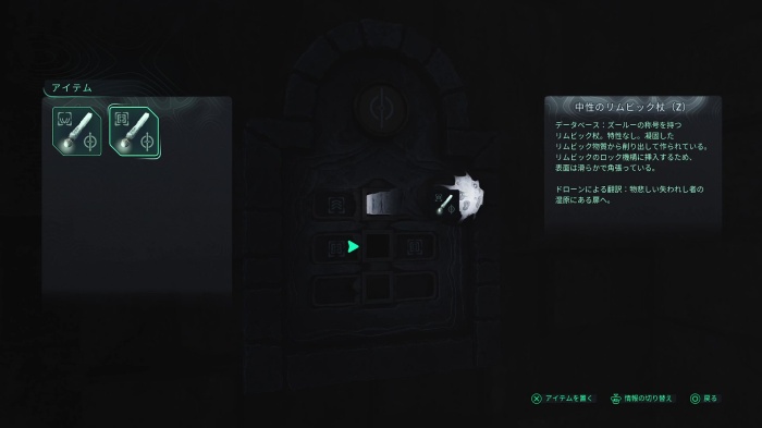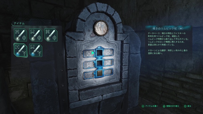 地下室に戻り、謎の箱に嘆きのリムビック杖をセットします。上がWで下がγです。箱が空いて象形文字-リムビックの修復が入手できます。