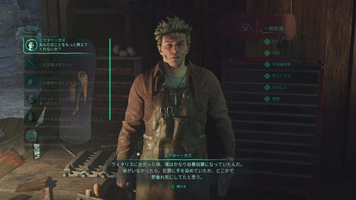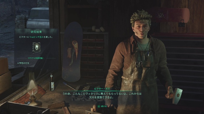 ヴィタリスの家を出ると向かい側でビクターが鍛冶屋を開いています。話しかけると新たなエリア「ヴィッサ・ヒルズ」に行けるようになります。また、クラフトが可能になるので武器や防具を強化しましょう。