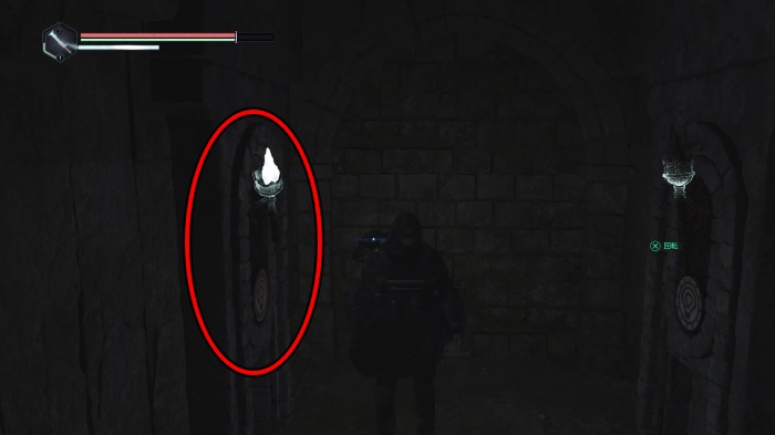 アイテムを入手したら反対側の左と右の壁にたいまつがあります。左だけ点灯させましょう。