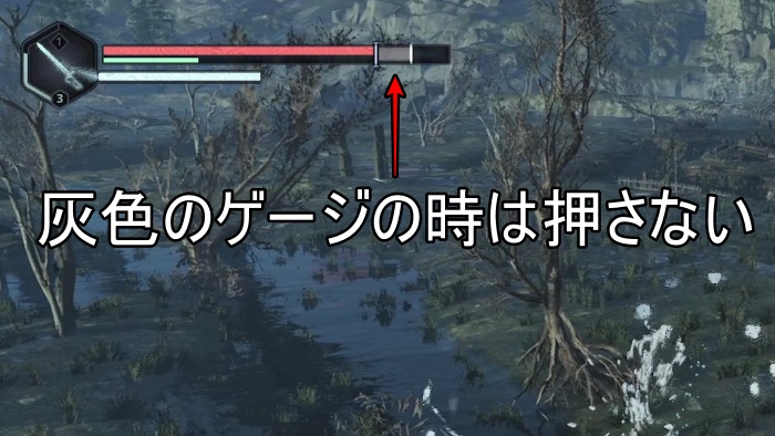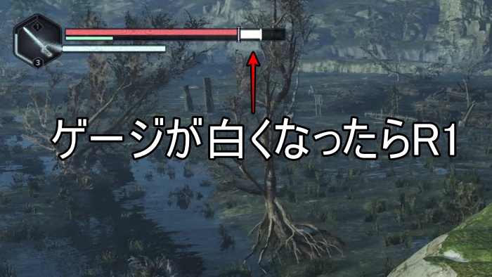 治癒パルスのコツは攻撃している時にゲージを見ておいて、白くなったタイミングでR1を押しましょう。灰色のタイミングで押すと失敗になって回復できません。いずれはゲージを見なくても発動できるようになるといいですが、最初はタイミングが分からないので、ゲージをガン見しておきましょう。